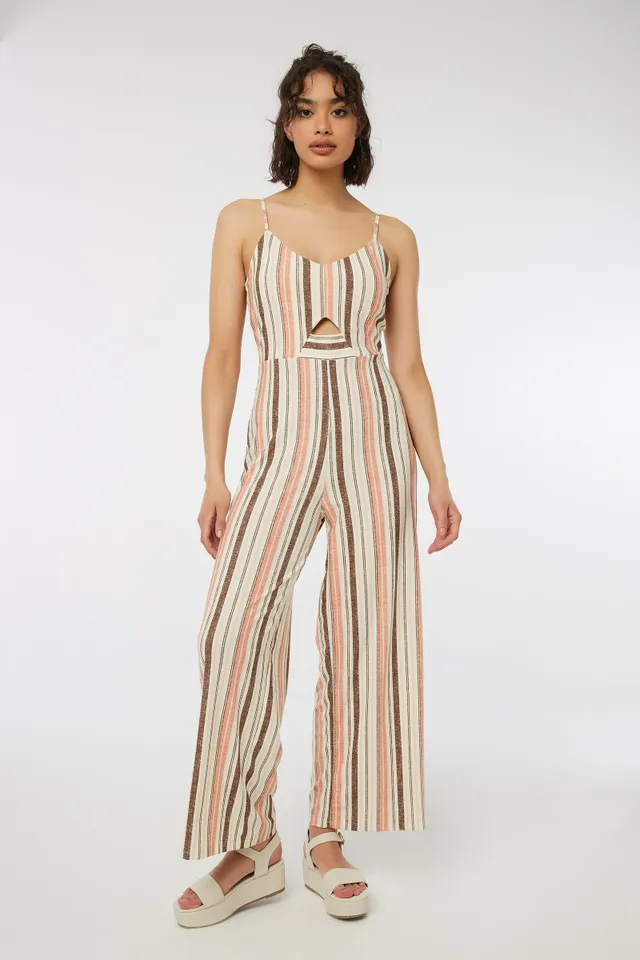 Ardene Striped Cut Out Jumpsuit In Beige | Size | Polyester/Spandex
